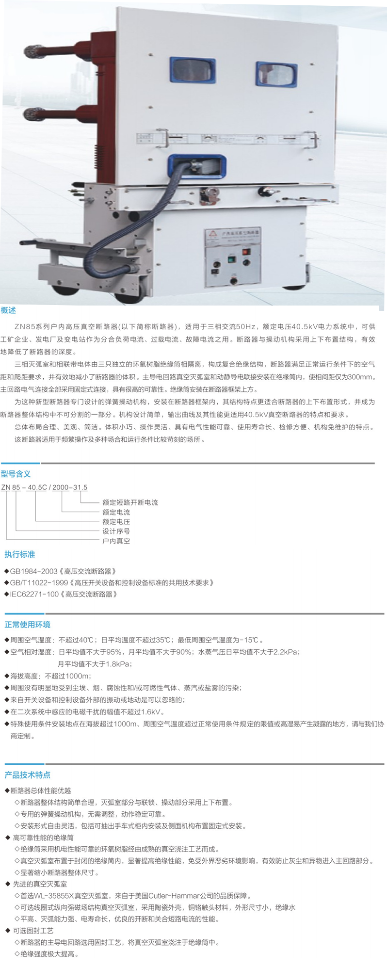 ZN85A-40.5型戶內(nèi)交流高壓真空斷路器適用于三相交流50hz、40.5kv系統(tǒng),可供工礦企業(yè)、發(fā)電廠及變電站作為分合負(fù)荷電流、過載電流、故障電流之用。并適用于頻繁操作的場(chǎng)合。