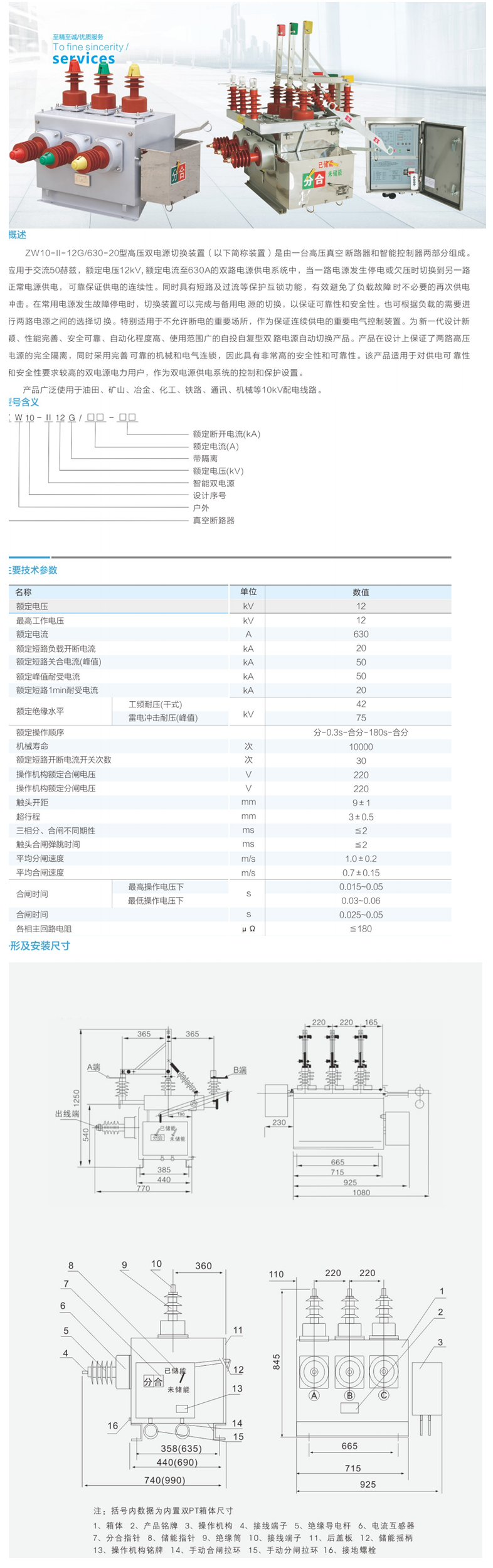 1、ZW10-11-12G/630-20型高壓雙電源切換裝置(以下簡稱裝置)是由一臺高壓真空斷路器和智能控制器兩部分組成;