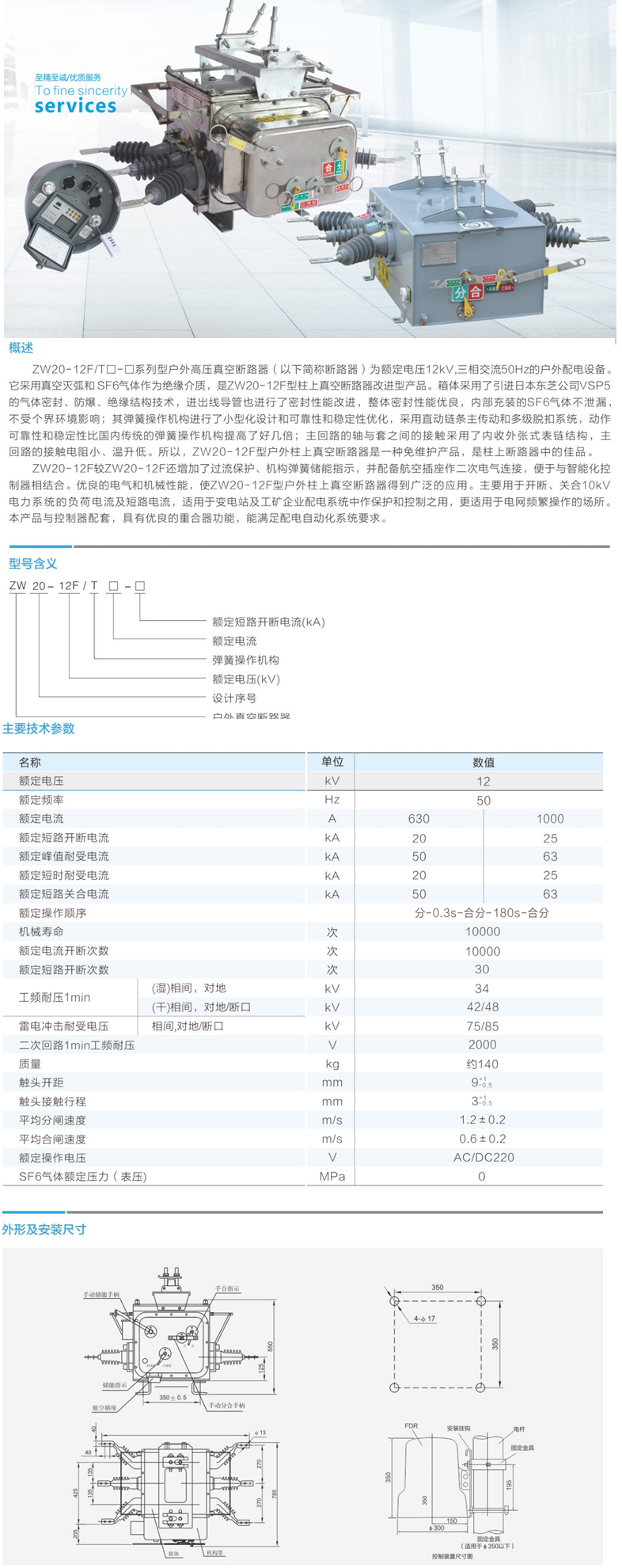 ZW20-12F戶外高壓真空斷路器具有手動和電動操作功能。具有良好的密封性能,使之不受外界環(huán)境影響,是一種免維護(hù)產(chǎn)品。該產(chǎn)品采用真空滅弧、SF6氣體作絕緣介質(zhì)。斷路器還可與隔離開關(guān)組成組合斷路器,可配置智能控制器,自備PT作為電源,成為有電壓、電流信號輸出并可控制的智能斷路器,是柱上斷路器的佳品,本斷路器還具有強大的電力看門狗功能,替代了FZW28F-12戶外分界真空負(fù)荷開關(guān)所有功能,該產(chǎn)品真正的實現(xiàn)了電力看門狗,成為電力市場的獨具之佳作