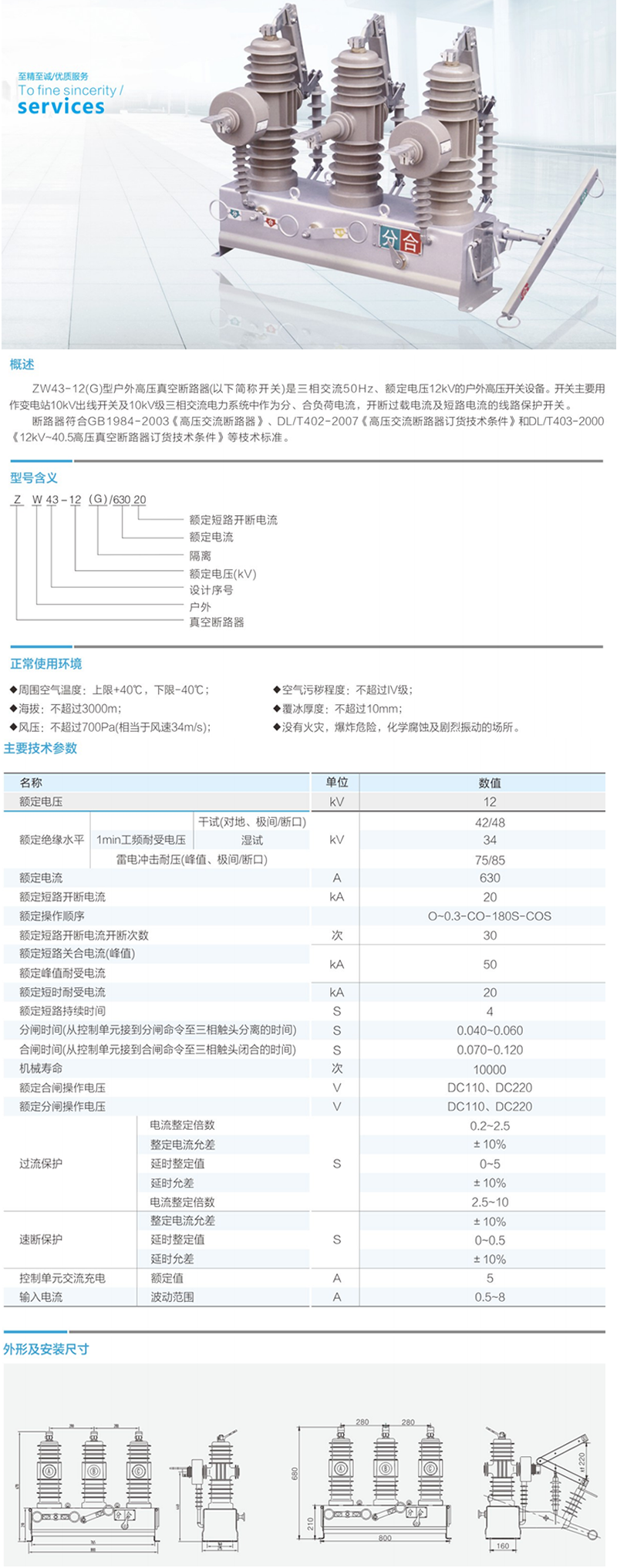 ZW43-12(ZW43A-12)型戶外高壓真空斷路器為額定電壓12kV、三相交流50Hz的戶外高壓開關(guān)設(shè)備。 主要用于開斷、 關(guān)合電力系統(tǒng)的負(fù)載電流、 過載電流及短路電流。產(chǎn)品適用于變電站、工礦企業(yè)及城鄉(xiāng)配電網(wǎng)作保護(hù)和控制,特別適用于操作頻繁的場所和城網(wǎng)自動(dòng)化配電網(wǎng)絡(luò)。符合下述標(biāo)準(zhǔn):